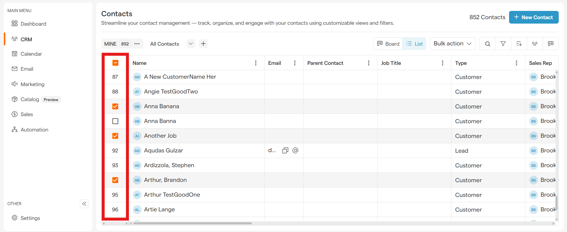 Hover over the numbers in the left column to select the checkboxes next to each contact you want to delete.