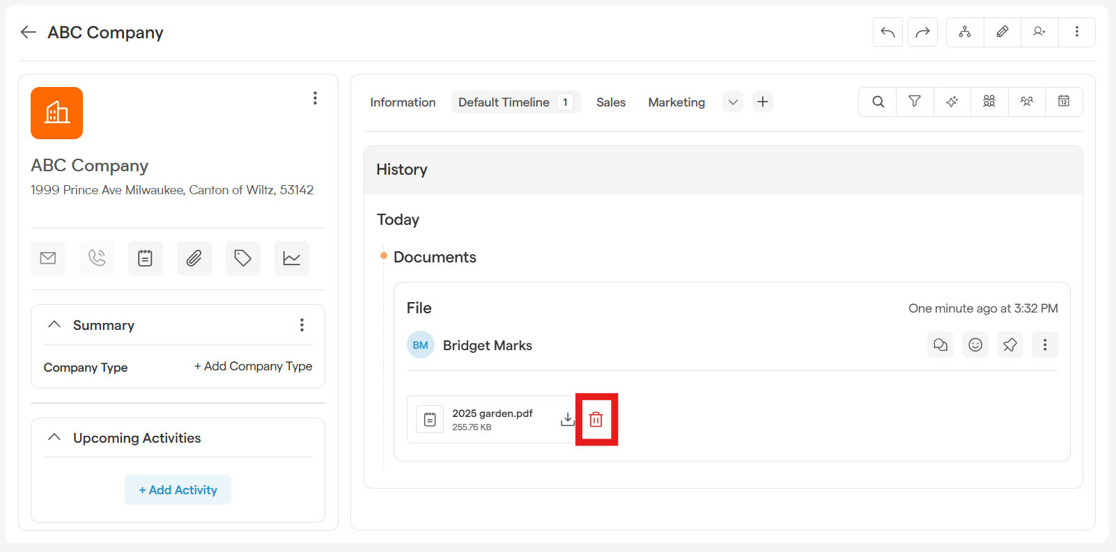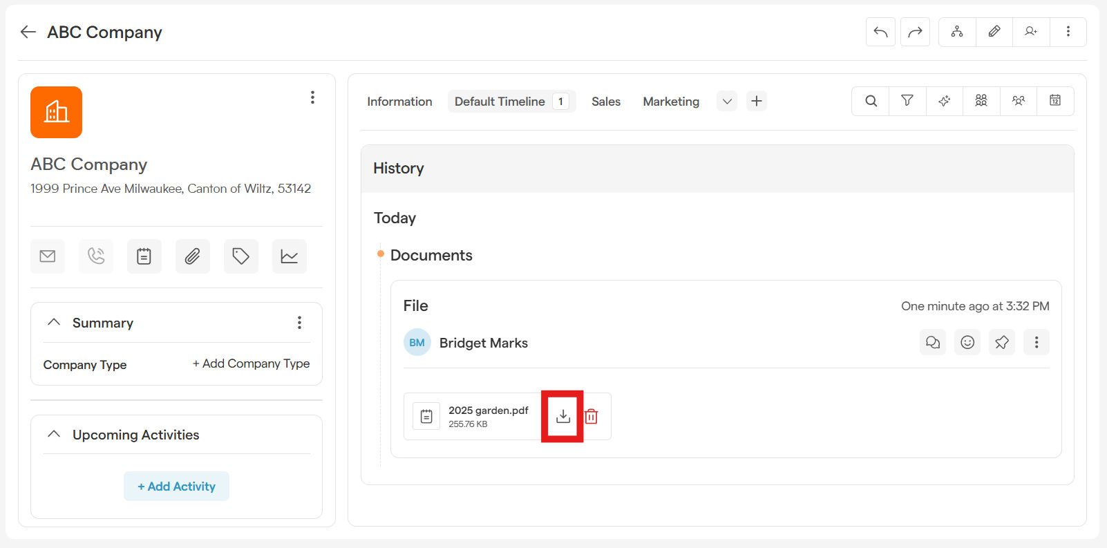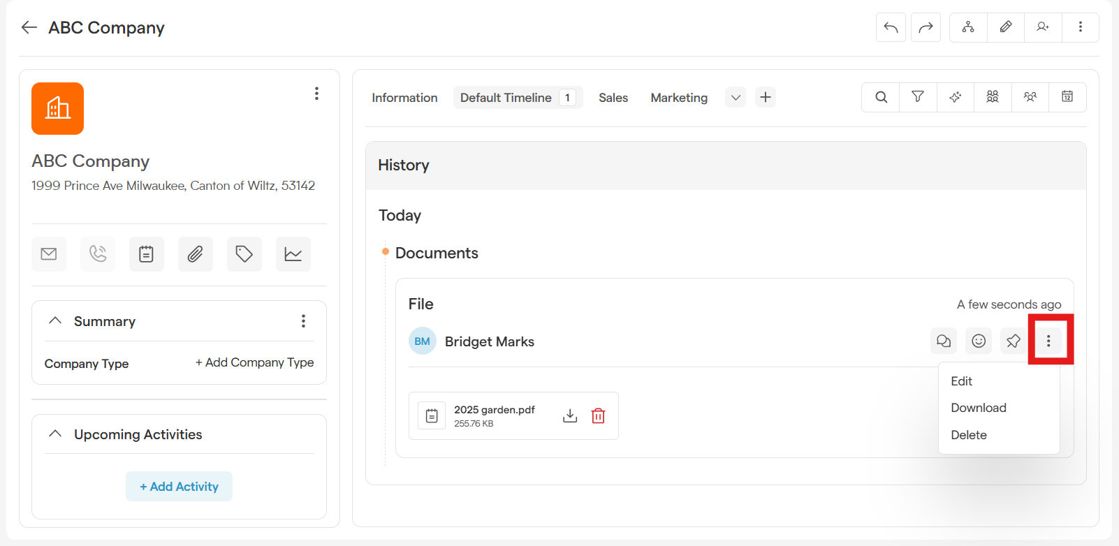 All of your attachments live in the record's Timeline. Once you find the file you're looking for, managing it is simple.