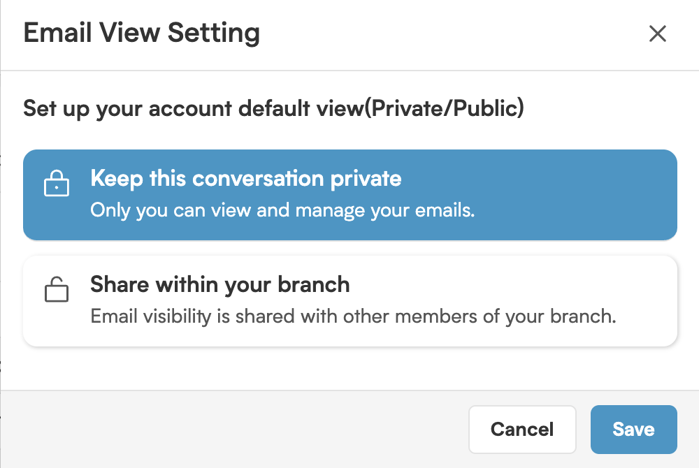 Once connected, you’ll be redirected to the email listing screen. Be sure to set your email view to Private or Public.