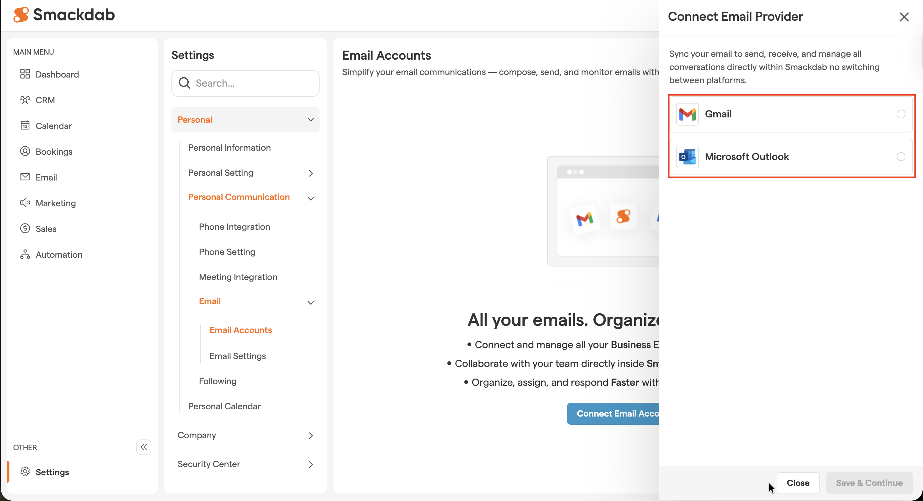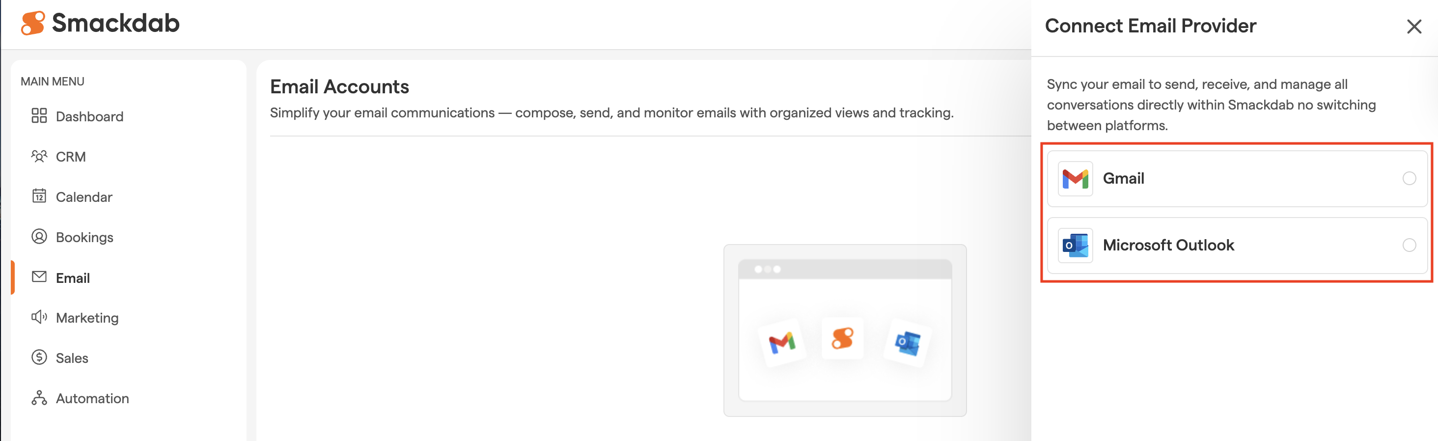 No worries! You can easily integrate your email in just a few clicks. Whether you're using Gmail or Microsoft Outlook, Smackdab.ai ensures a seamless connection for effortless communication.