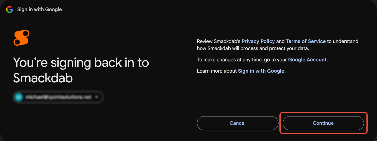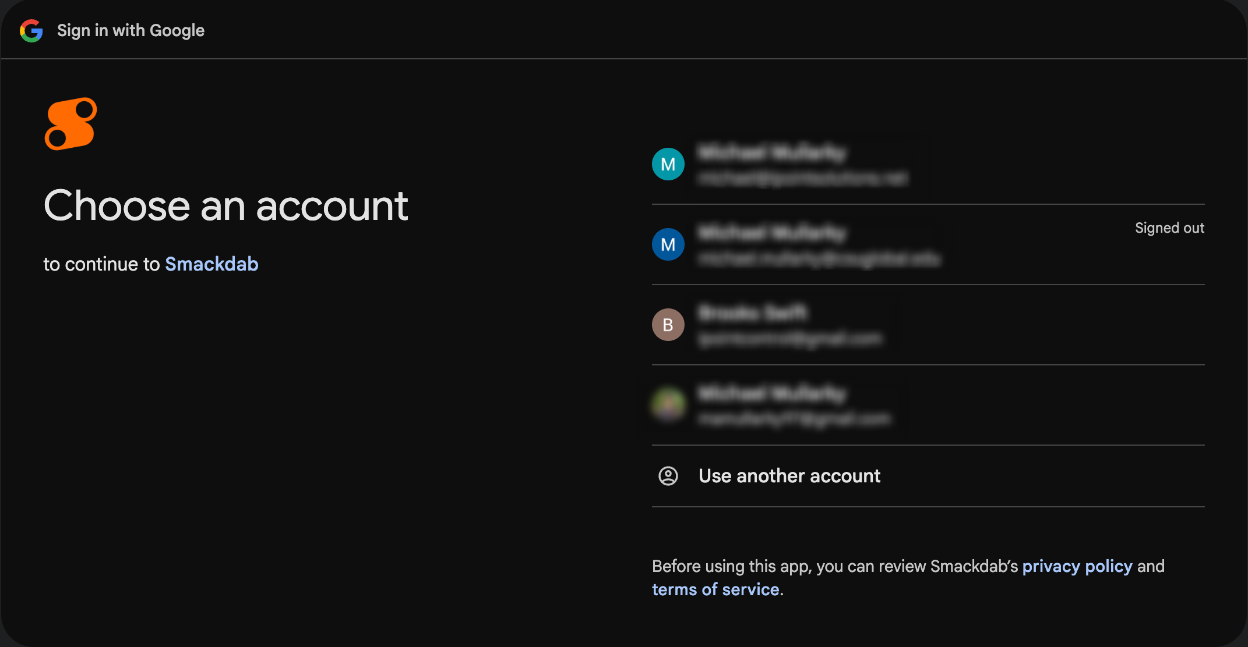 By continuing, Google will share your name, email address, language preference and profile picture with Smackdab. See Smackdab’s privacy policy and Terms of Service.