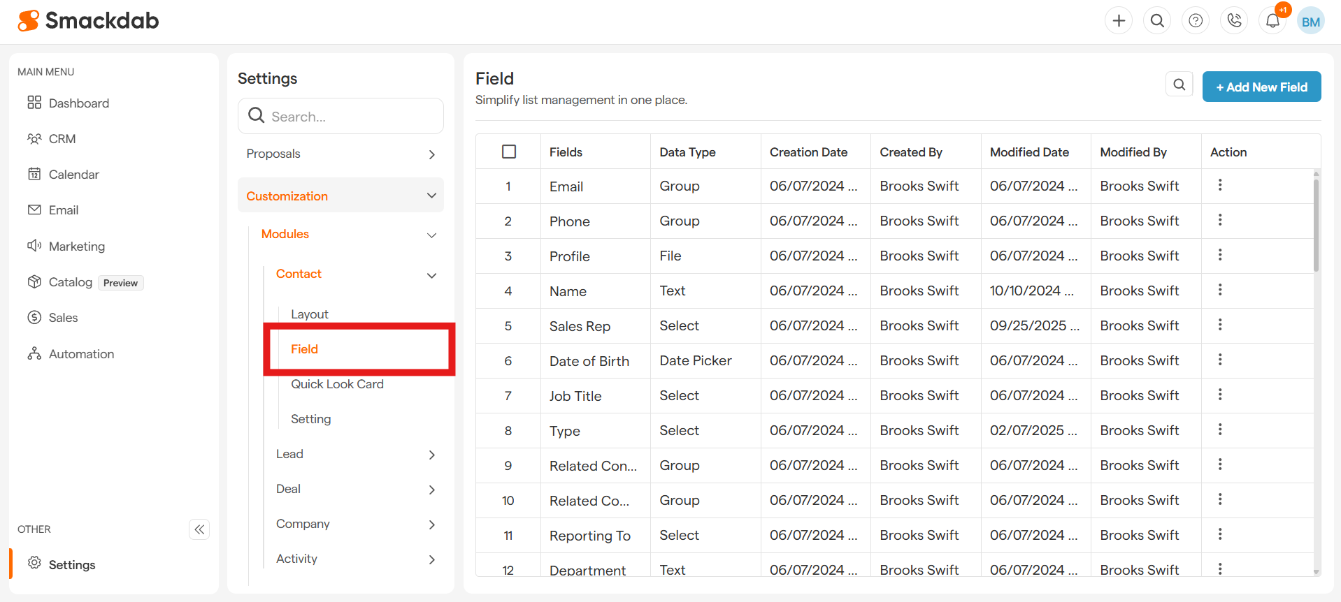 Click + New Field in the top-right corner.