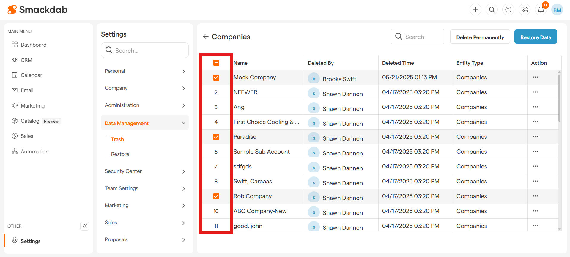 📝 Note: Smackdab.ai automatically stores deleted companies in the Trash for 7 days. After that, they are permanently deleted for better data management.