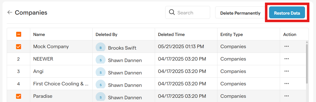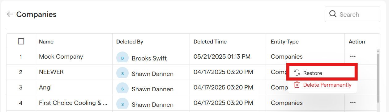 Once restored, the company will reappear in your Companies module, along with all details!