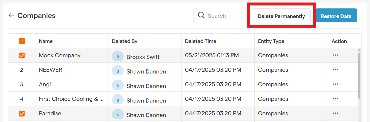 To Permanently Delete Companies: Select Delete Permanently