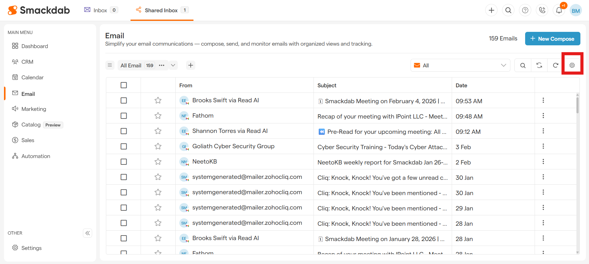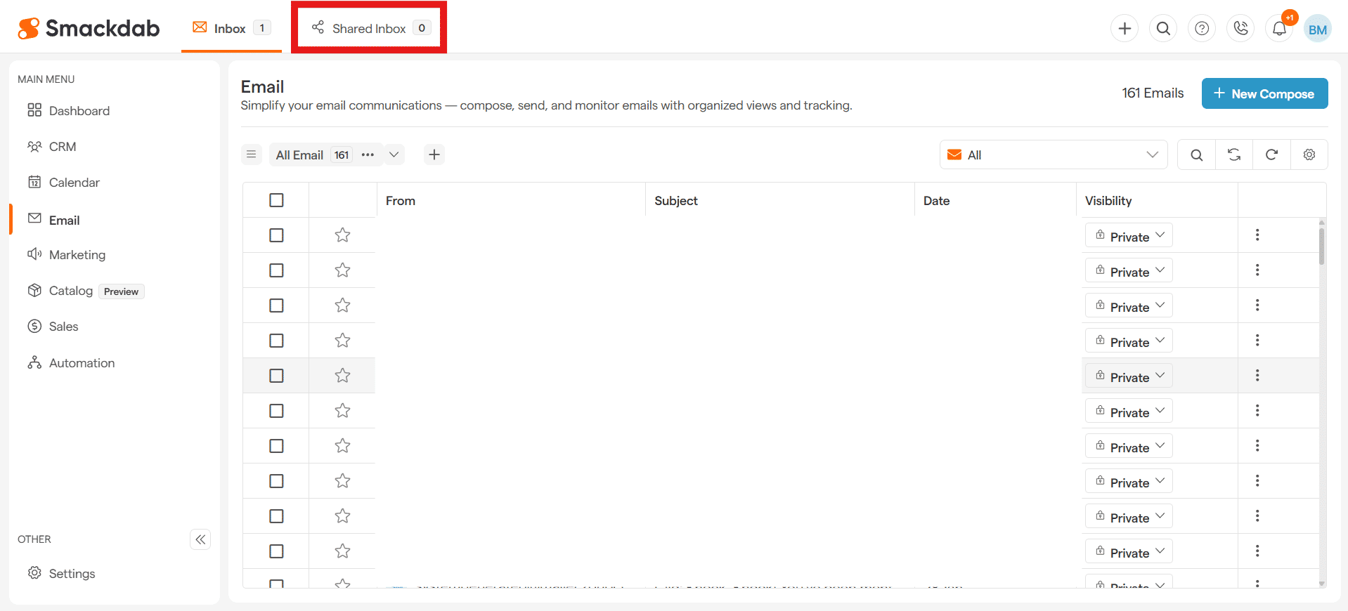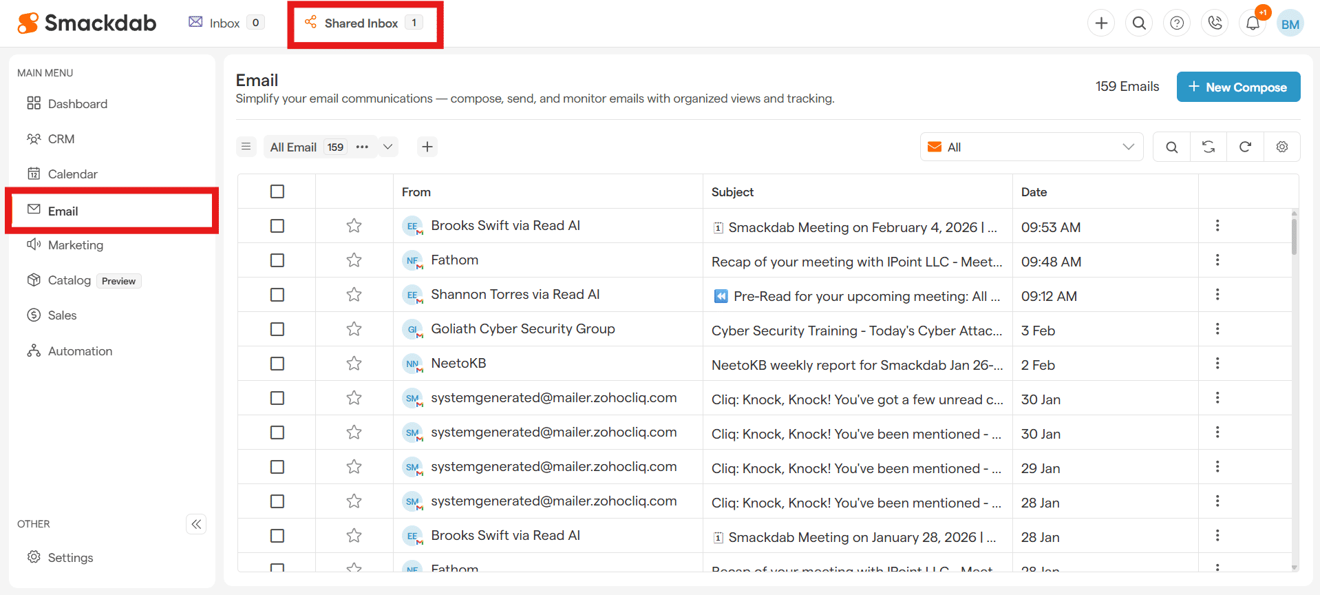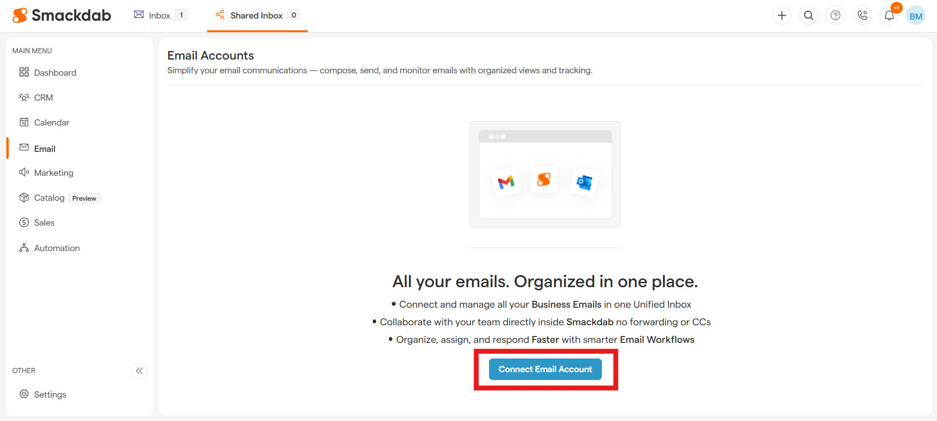 The Shared Email Inbox in Smackdab allows teams to collaboratively manage emails from a single email account. Multiple users can access, read, send, and manage conversations from one shared inbox—making it ideal for support, sales, or operations teams. This article explains how to connect a shared email account and share it with other Smackdab users.